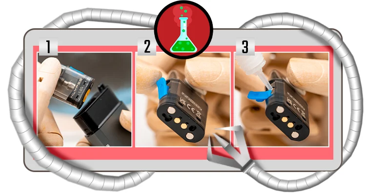 - 拆卸煙彈,打開填充蓋,將電子煙液體倒入煙彈中,注意不要過量。