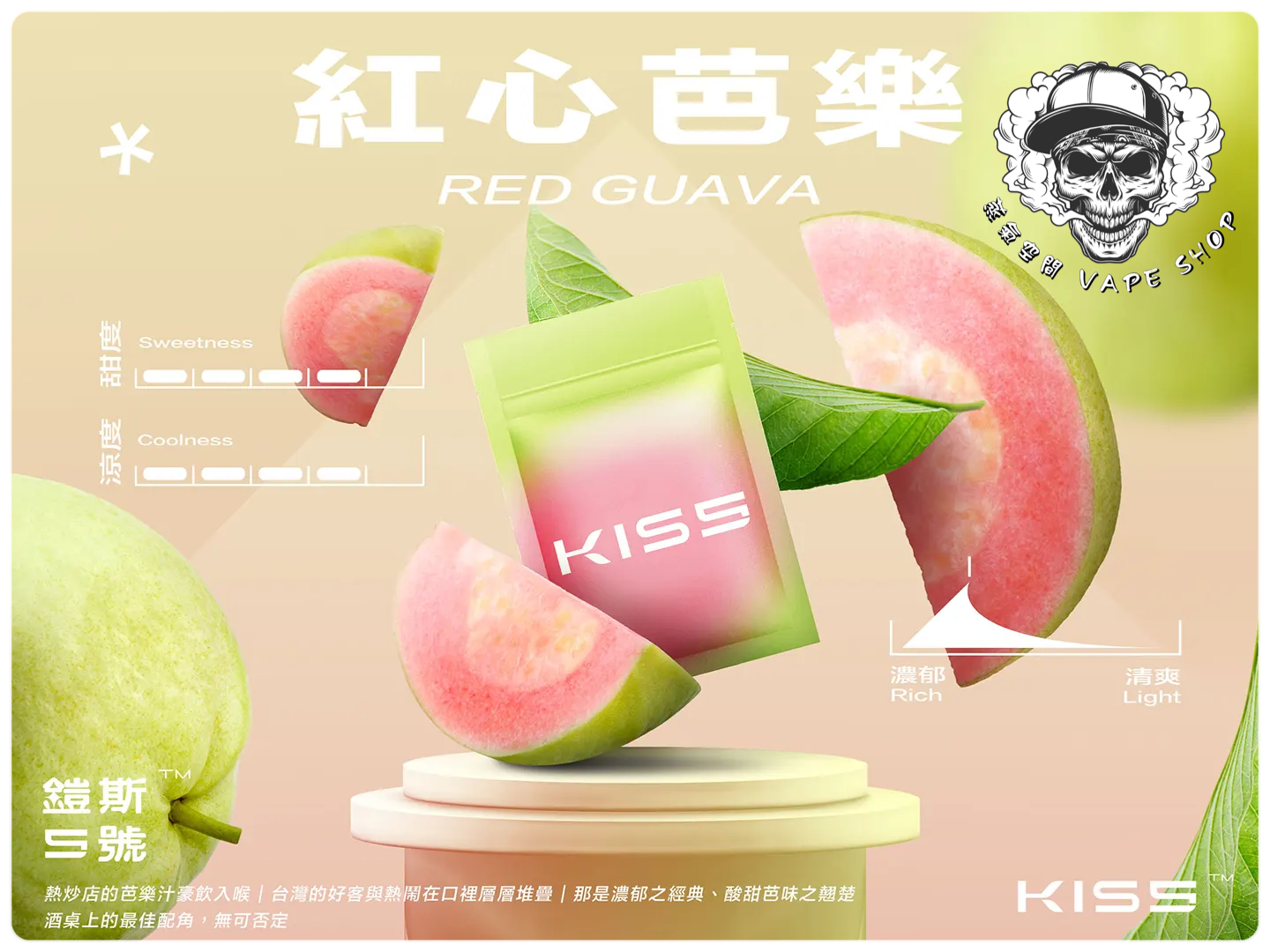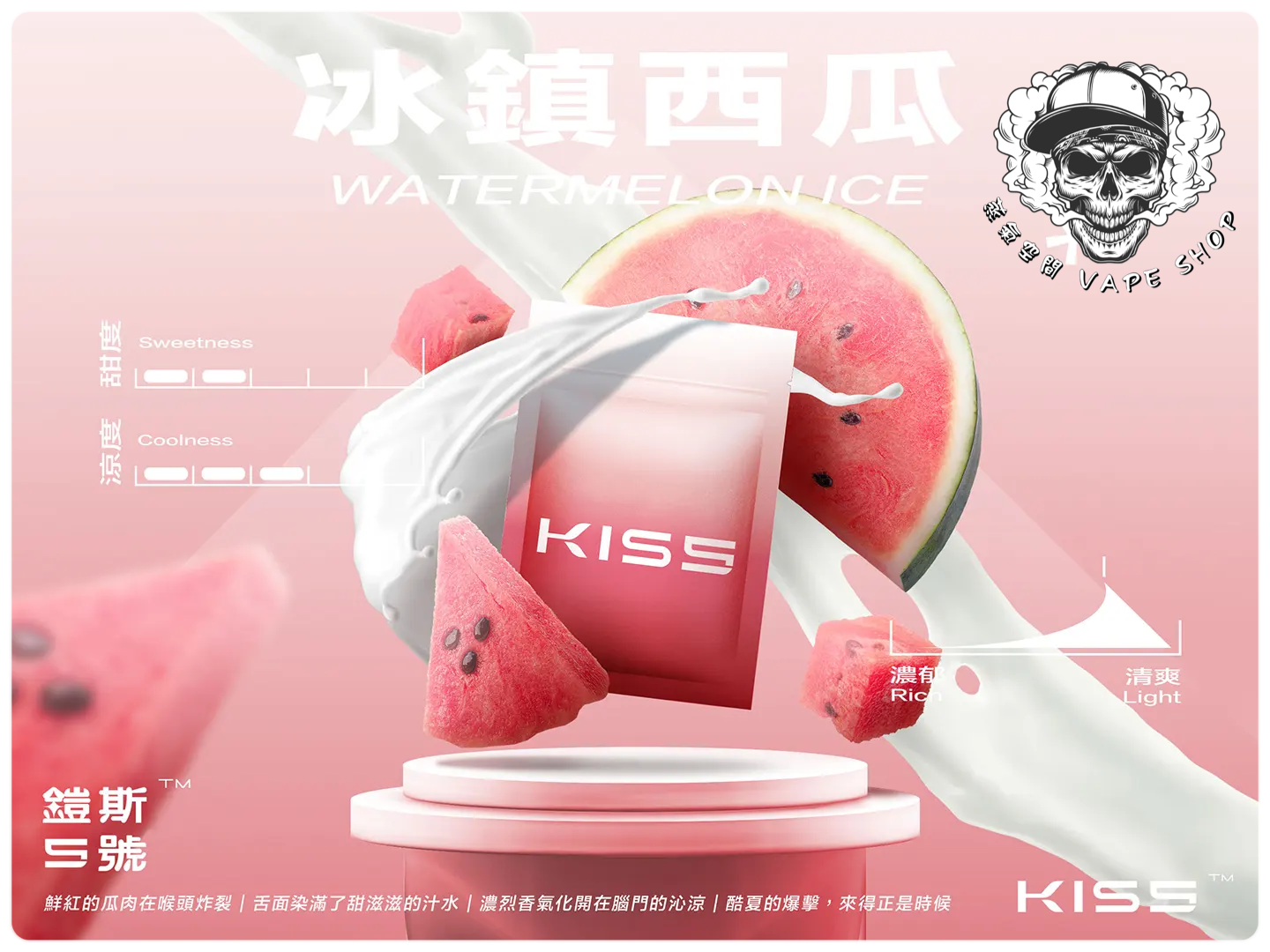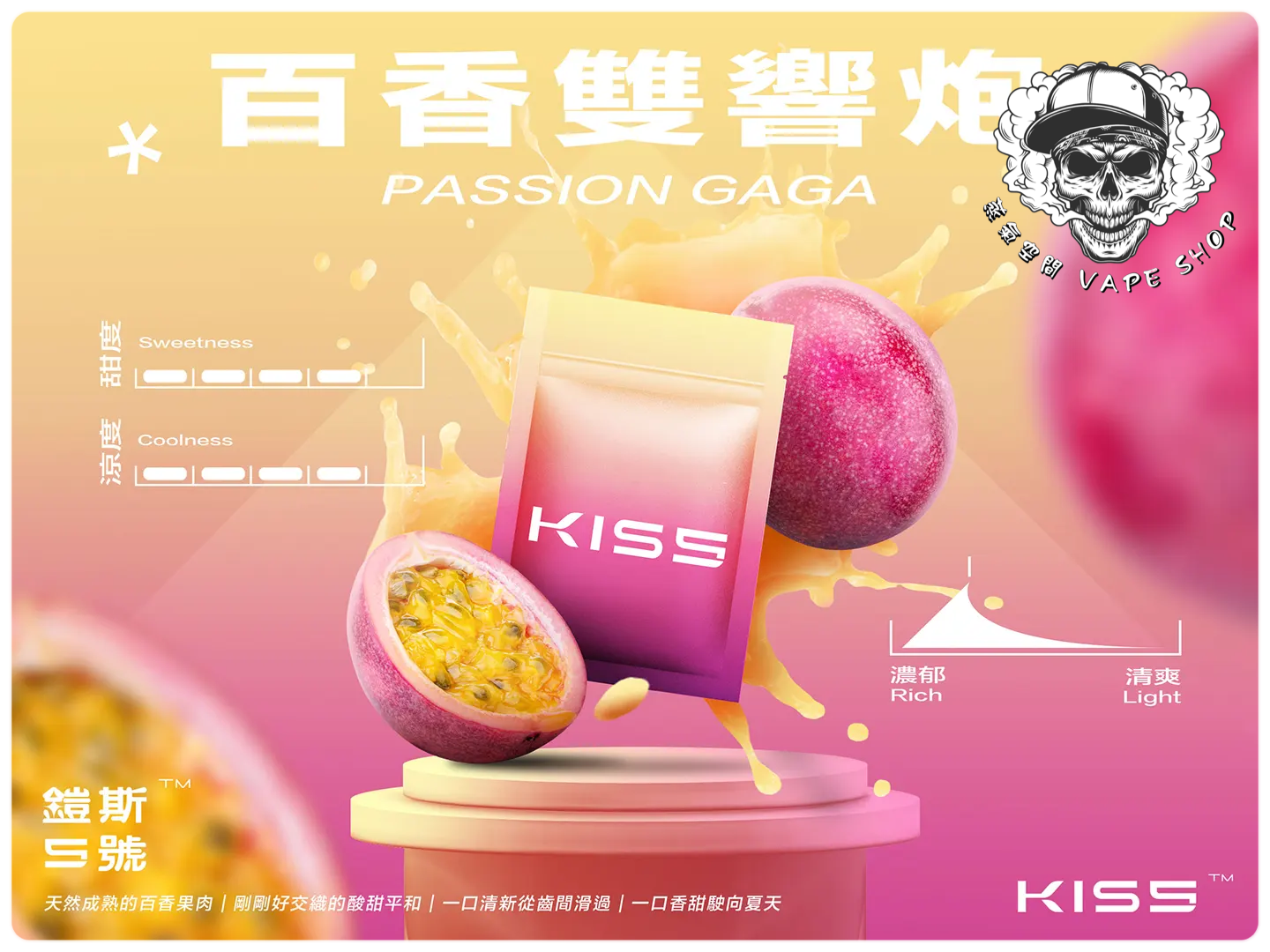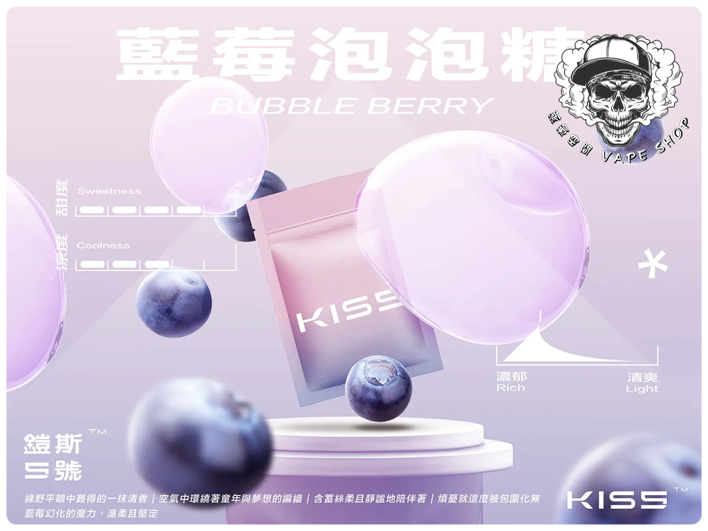| KISS煙彈(3入) | 抹茶梅果, 藍莓泡泡糖, 百香雙響炮, 冷泡冰茶, 寶礦力水德, 鳳梨碎片, 超薄荷, 麥根沙士, 經典綠豆沙, 哈密瓜, 紅心芭樂, 海鹽檸檬, 葡萄原汁, 爆汁蜜桃, 愛文芒果, 加州蘋果, 蜜桃烏龍茶, 超級可樂, 珍珠奶茶, 冰鎮西瓜, 微醺櫻桃, 空煙彈 |