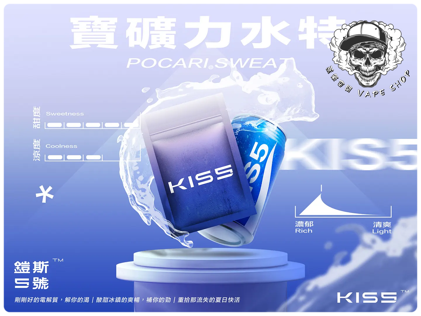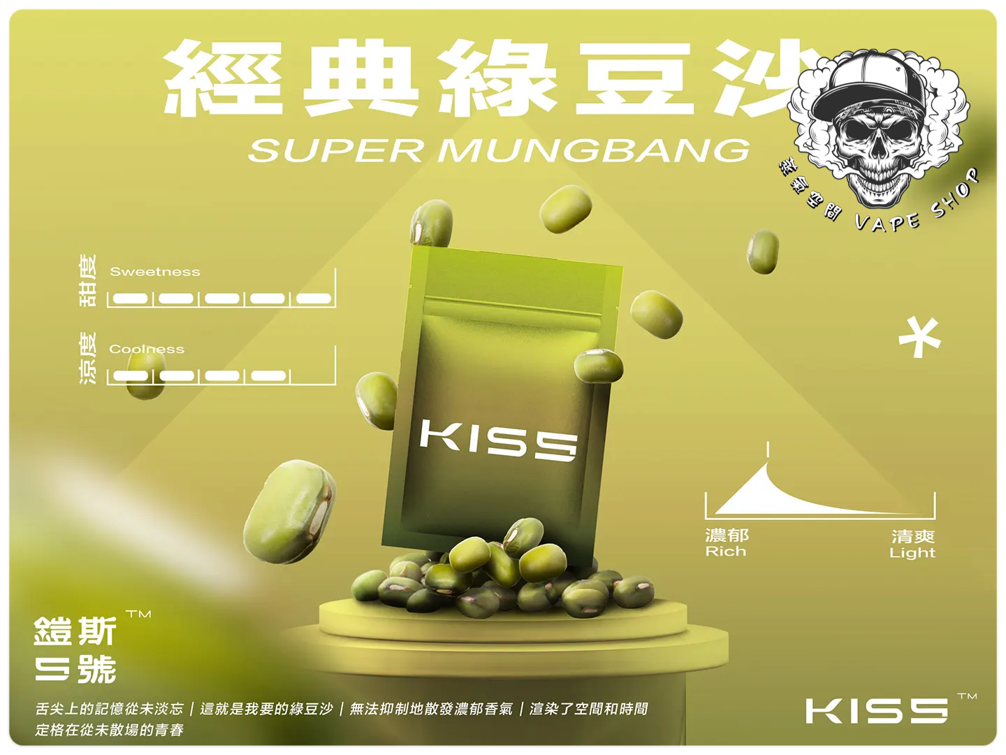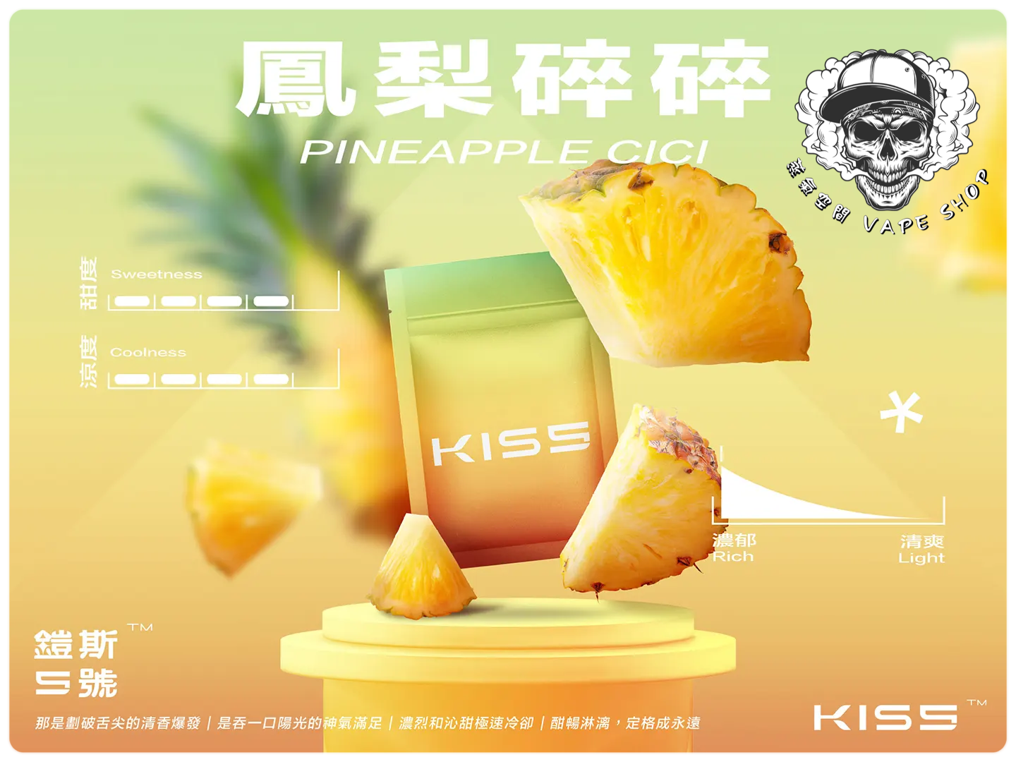 | KISS煙彈(3入) | 抹茶梅果, 藍莓泡泡糖, 百香雙響炮, 冷泡冰茶, 寶礦力水德, 鳳梨碎片, 超薄荷, 麥根沙士, 經典綠豆沙, 哈密瓜, 紅心芭樂, 海鹽檸檬, 葡萄原汁, 爆汁蜜桃, 愛文芒果, 加州蘋果, 蜜桃烏龍茶, 超級可樂, 珍珠奶茶, 冰鎮西瓜, 微醺櫻桃, 空煙彈 |