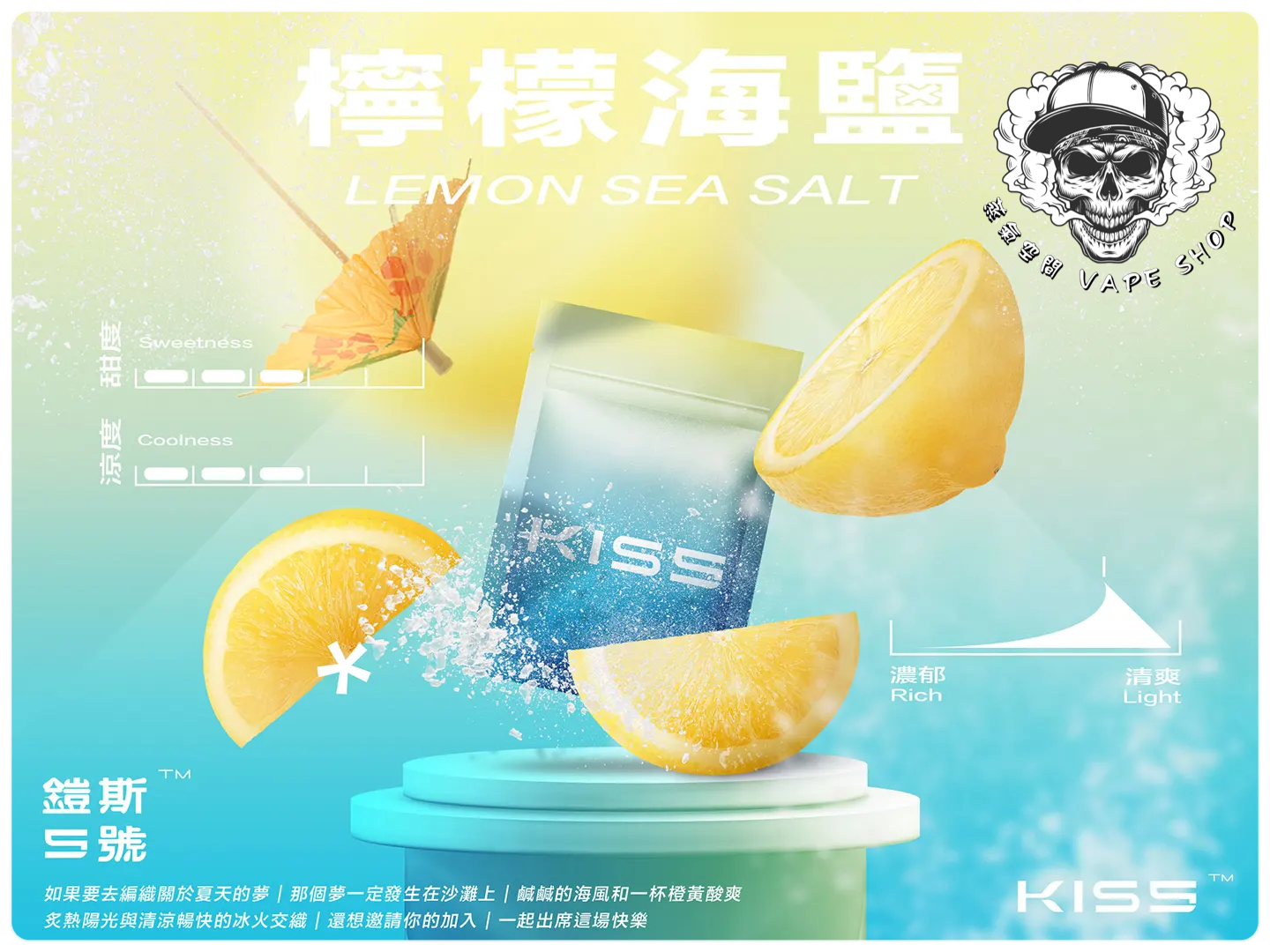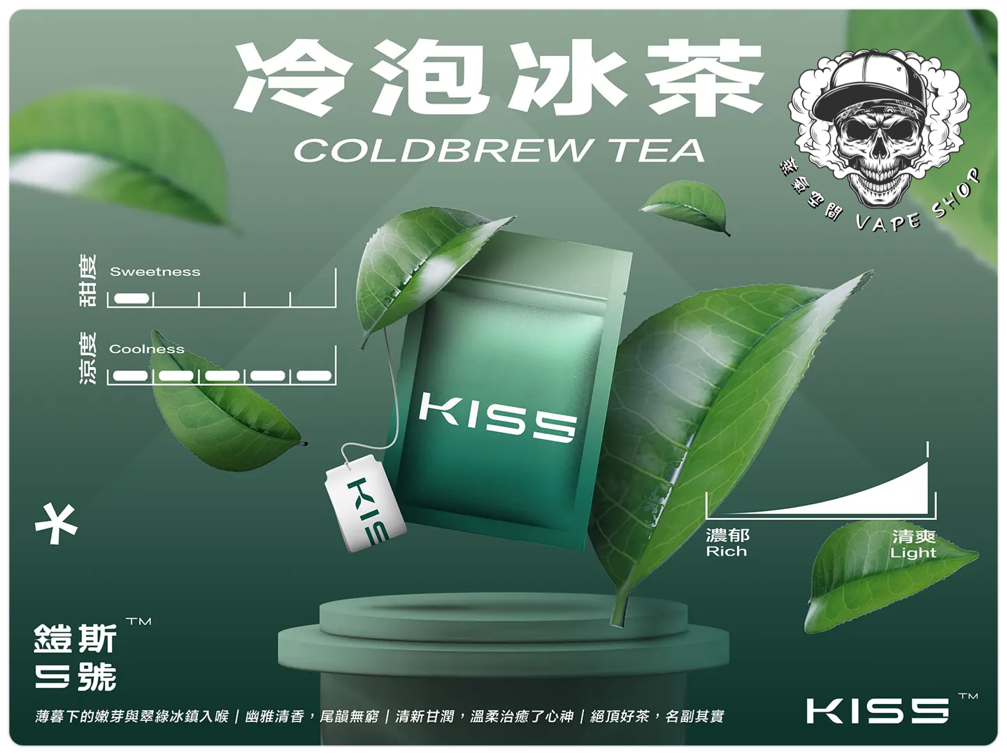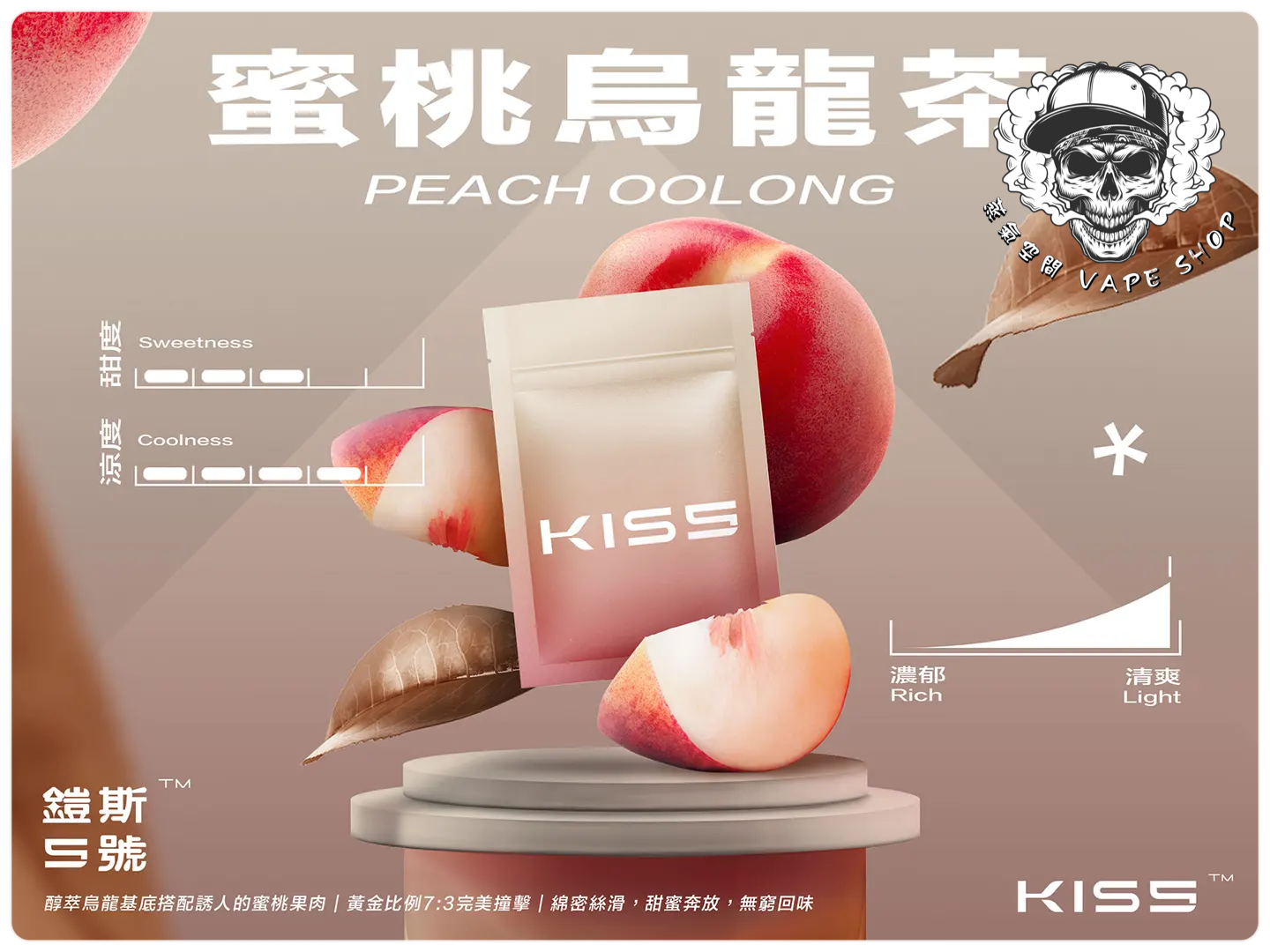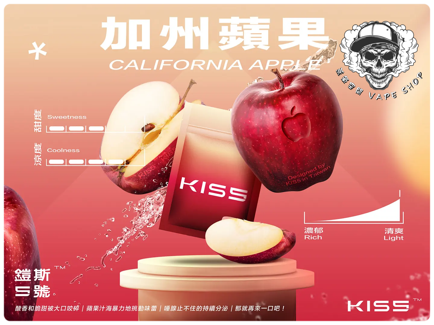 | KISS煙彈(3入) | 抹茶梅果, 藍莓泡泡糖, 百香雙響炮, 冷泡冰茶, 寶礦力水德, 鳳梨碎片, 超薄荷, 麥根沙士, 經典綠豆沙, 哈密瓜, 紅心芭樂, 海鹽檸檬, 葡萄原汁, 爆汁蜜桃, 愛文芒果, 加州蘋果, 蜜桃烏龍茶, 超級可樂, 珍珠奶茶, 冰鎮西瓜, 微醺櫻桃, 空煙彈 |