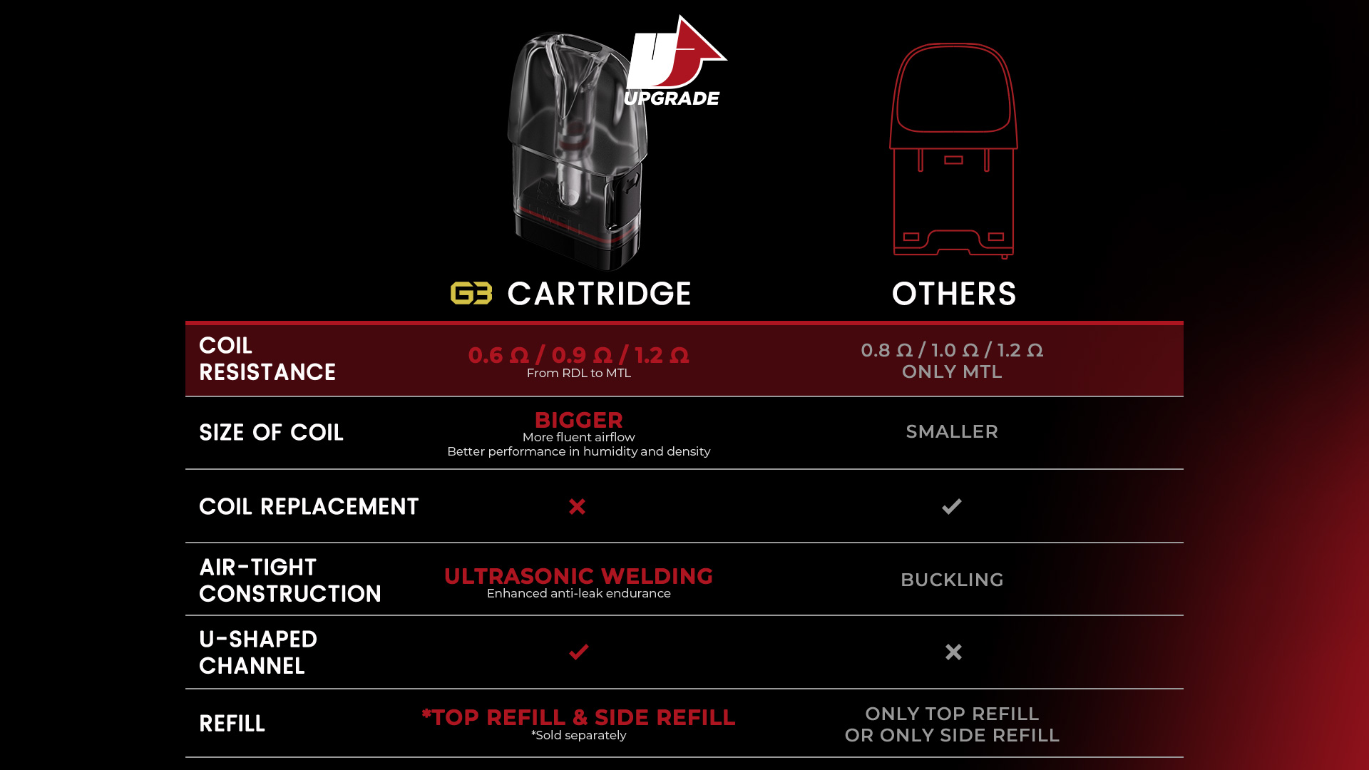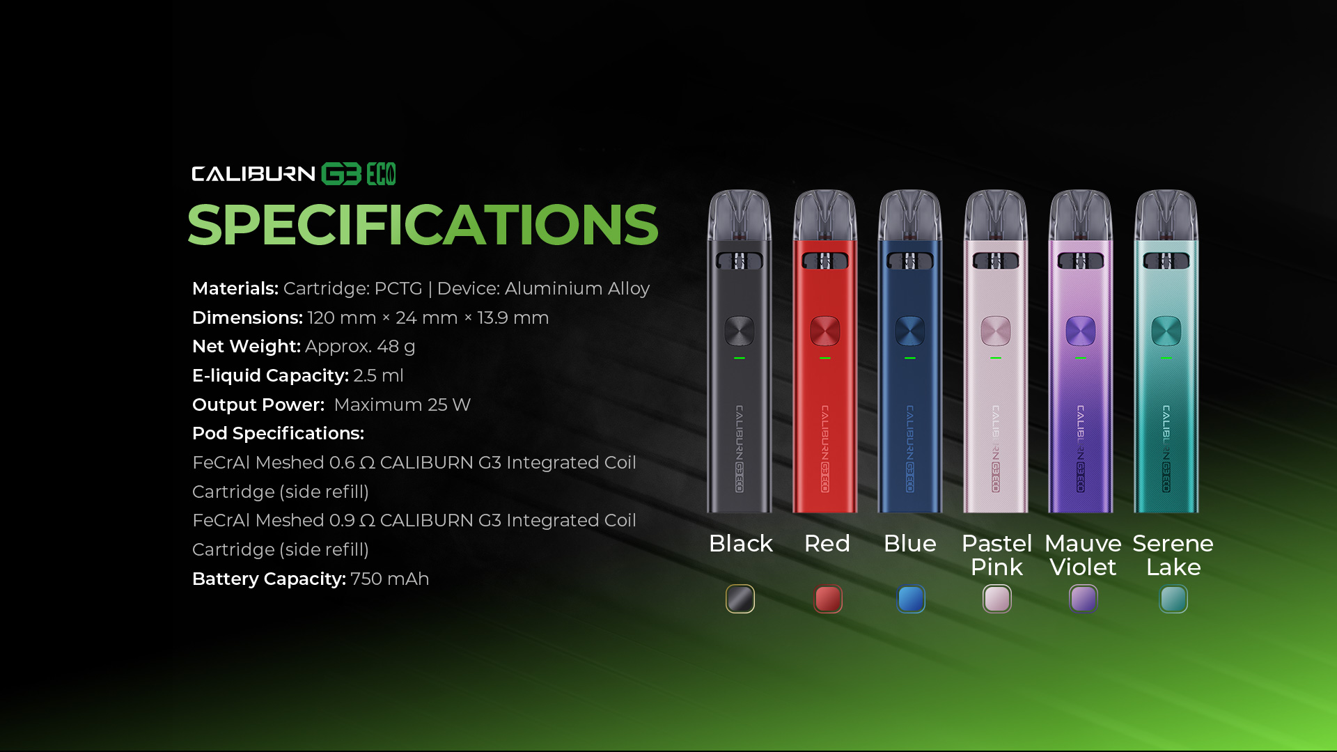 • 多樣化的線圈選擇: Caliburn G3 提供 0.6Ω、0.9Ω 和 1.2Ω 的線圈選項,滿足不同的吸食偏好。