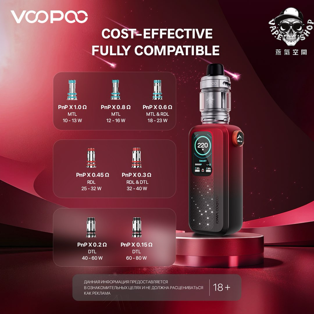 - 220W 強力輸出: 雙 18650 電池驅動(不含),支援高瓦數霧化。