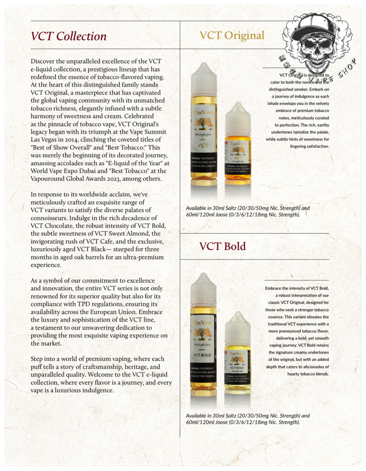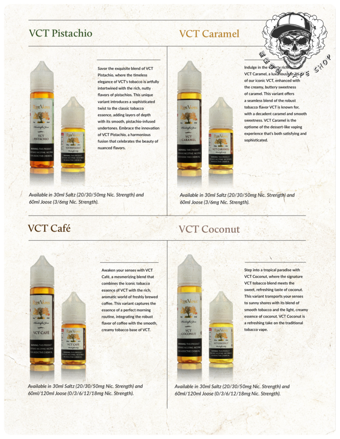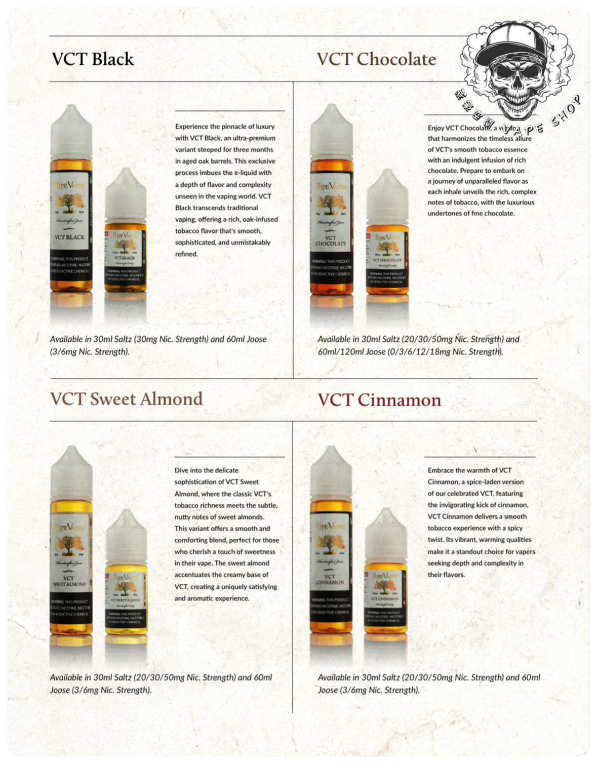 - VCT(香草奶油煙草):將濃郁的煙草風味與香草奶油蛋奶凍結合,帶來順滑且豐富的口感。